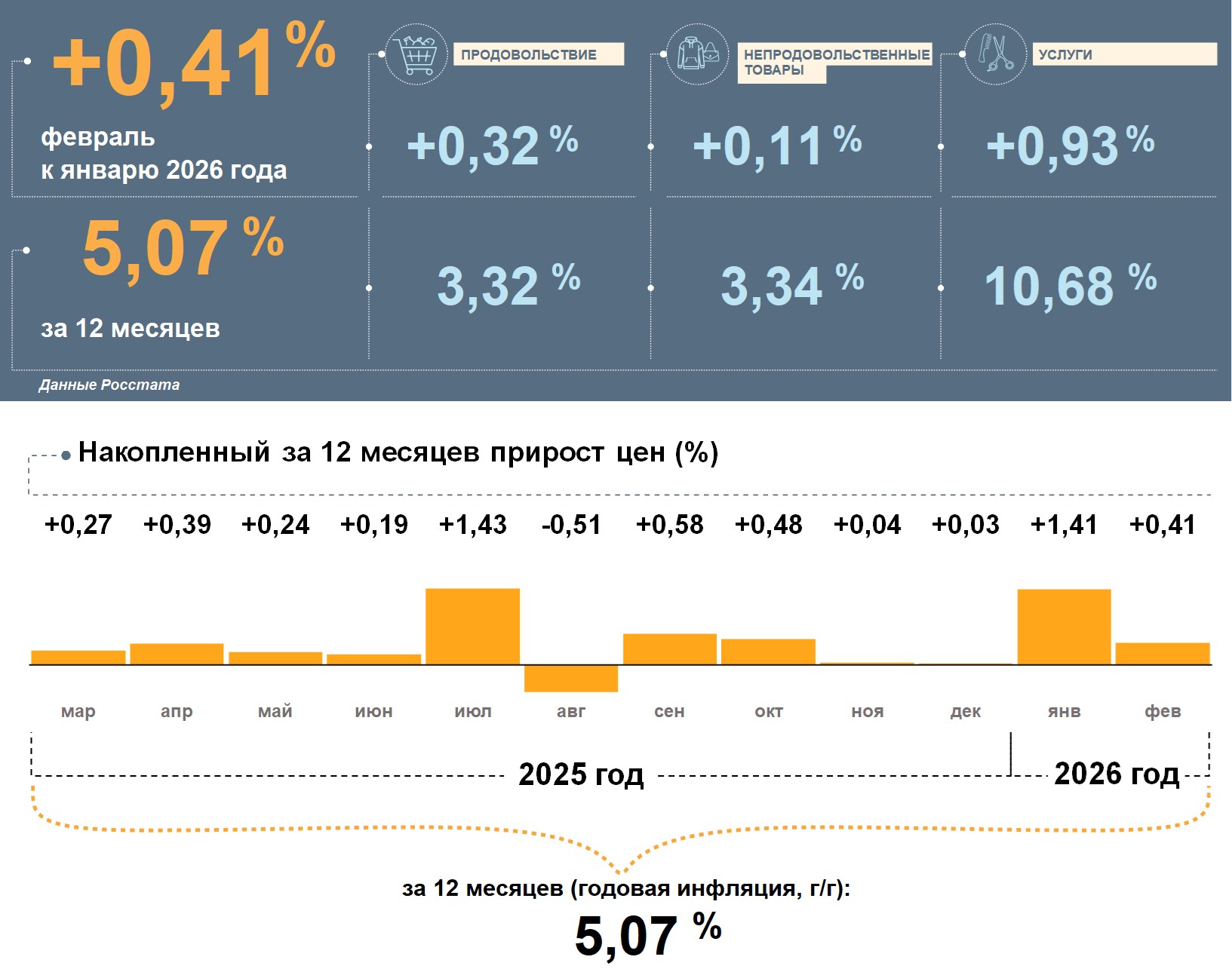 По данным Росстата, цены в Республике Мордовия в феврале 2026 года выросли на 0,41% к январю. Годовая инфляция замедлилась и составила 5,07%. Это меньше общероссийского значения (5,91%).