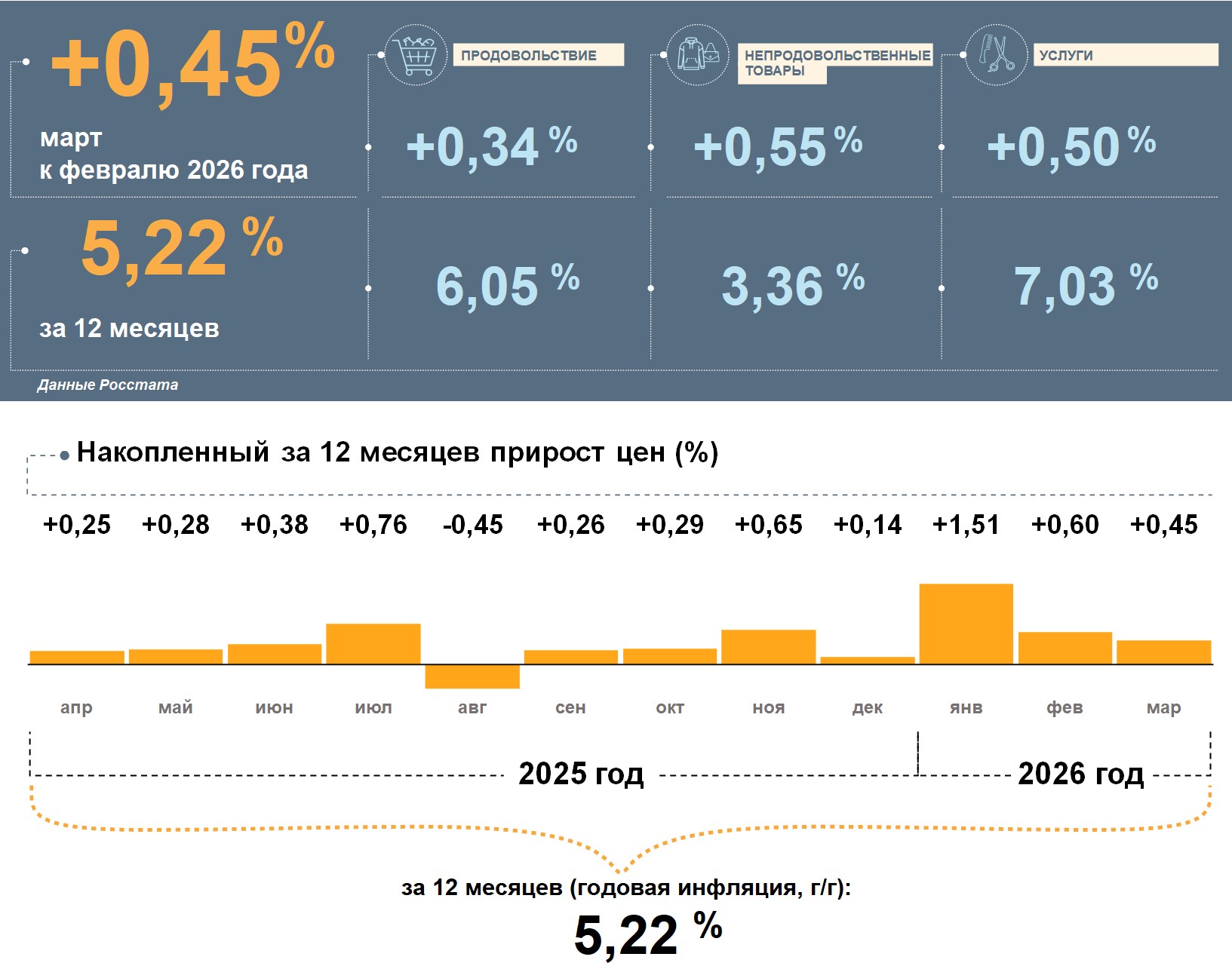 Сильнее всего в марте подорожали непродовольственные товары, при этом за год цены на них выросли умеренно. Цены на услуги за месяц тоже выросли, а в годовом выражении — наиболее заметно. Продовольственные товары в марте подорожали умеренно, но в годовом выражении цены на них выросли сильнее, чем на потребительскую корзину в целом.