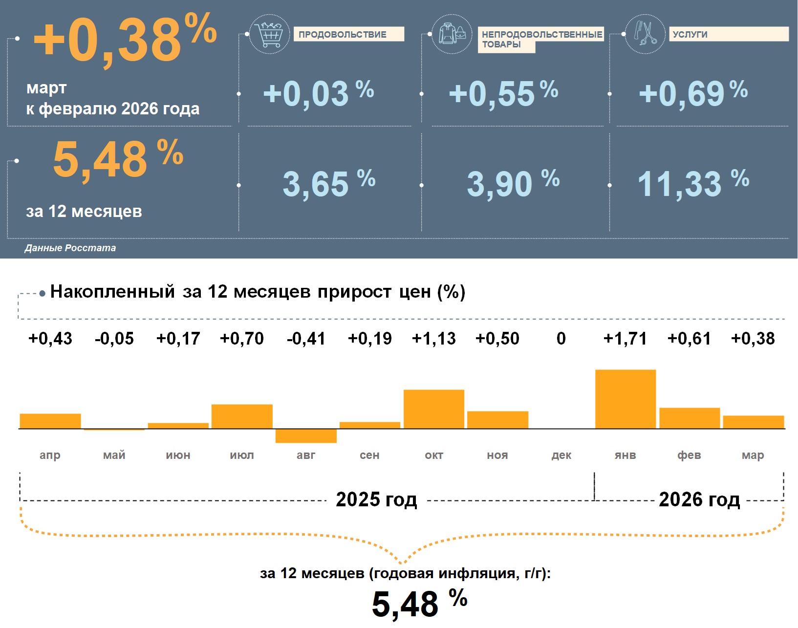 Цены в Алтайском крае в марте 2026 года, по данным Росстата, выросли на 0,38% в сравнении с февралем. Годовая инфляция снизилась и составила 5,48%. Это ниже, чем в целом по стране (5,86%).