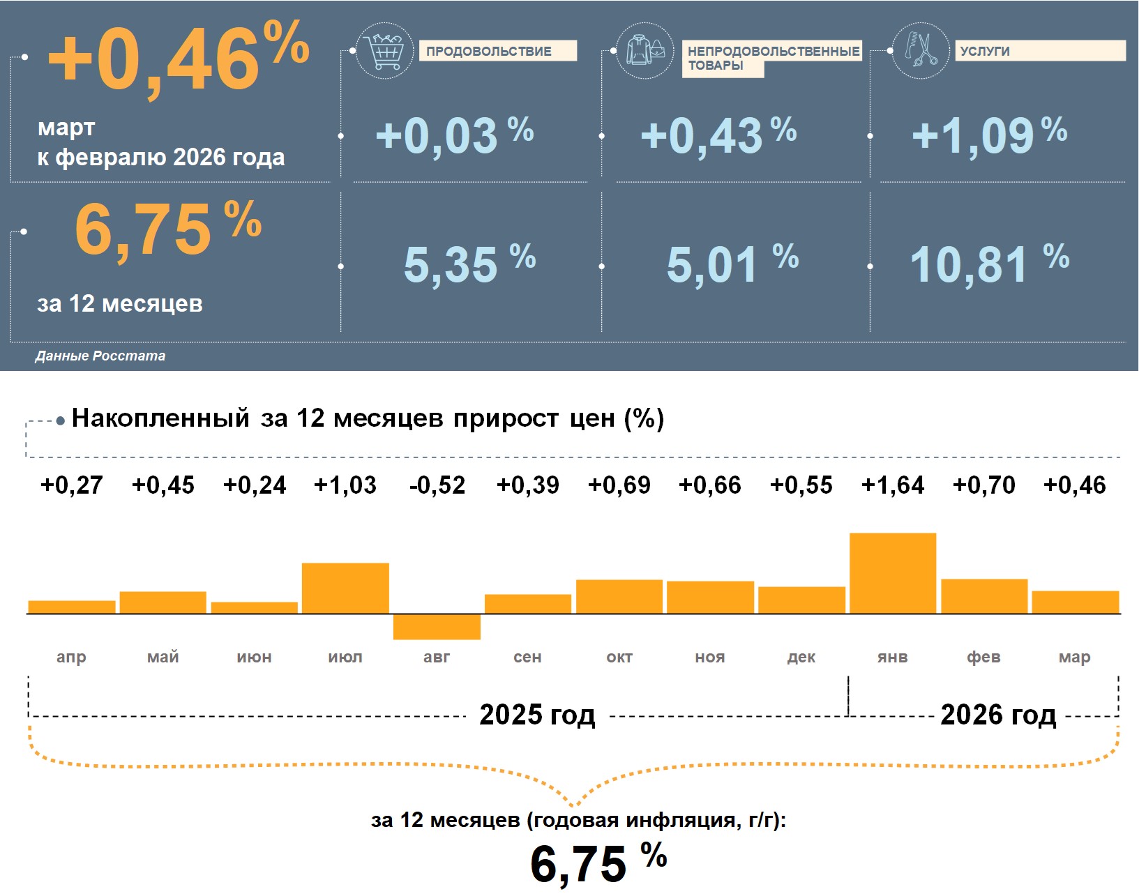 Цены в Свердловской области в марте 2026 года, по данным Росстата, выросли на 0,46% к февралю. Годовая инфляция замедлилась и составила 6,75%. Это выше, чем в целом по стране (5,86%).