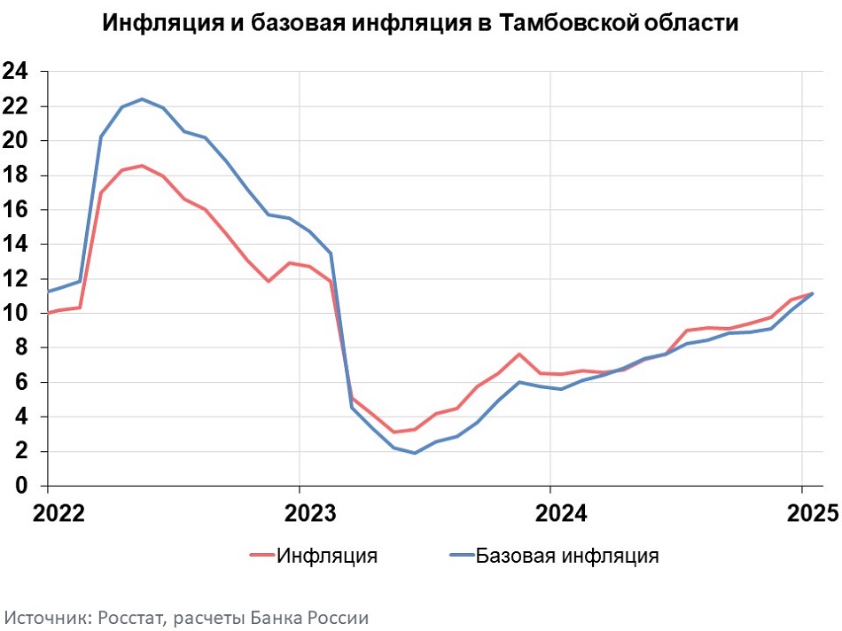 Годовая инфляция в Тамбовской области в январе 2025 года увеличилась до 11,17% после 10,80% в предыдущем месяце. Это соответствовало динамике по Центральному федеральному округу и России. Уровень инфляции в регионе сложился выше, чем в Центральном федеральном округе (10,07%) и по России в целом (9,92%). Рост цен в регионе ускорился в основном из-за увеличения издержек производителей продовольствия, сокращения предложения некоторых продуктов питания, повышения спроса на отдельные услуги, а также большей, чем год назад, индексации некоторых жилищных услуг.