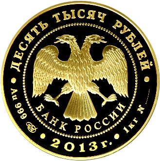 в центре - эмблема Банка России (двуглавый орел с опущенными крыльями, под ним - надпись полукругом "БАНК РОССИИ"), обрамленная кругом из точек и надписями, вверху - номинал: "ДЕСЯТЬ ТЫСЯЧ РУБЛЕЙ", внизу: слева - обозначения драгоценного металла, пробы сплава и товарный знак монетного двора, в центре - год выпуска "2013 г.", справа – содержание химически чистого металла и порядковый номер монеты №___.