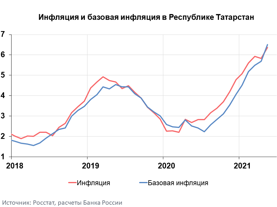 Годовая инфляция в Республике Татарстан в мае 2021 года ускорилась до 6,37% после 5,83% в апреле 2021 года. Влияние на динамику цен оказывали преимущественно восстановление спроса, перенос в цены возросших издержек производителей и рост мировых цен на ряд товаров. Годовой темп прироста цен несколько превысил уровень в целом по Приволжскому федеральному округу (ПФО, 6,30%) и по России в целом (6,02%).