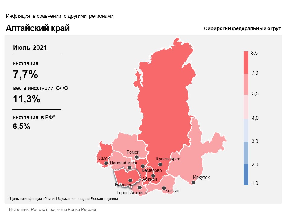 Годовая инфляция в Сибирском федеральном округе в июле по сравнению с июнем ускорилась на 0,32 п.п., до 6,88%, находясь выше показателя по России — 6,46%. Влияние на динамику инфляции в округе оказывали продолжающееся расширение потребительского спроса, рост мировых цен на ряд товаров, давление со стороны издержек производителей и поставщиков, а также индексация тарифов на отдельные услуги ЖКХ в ряде регионов в большем размере, чем годом ранее.