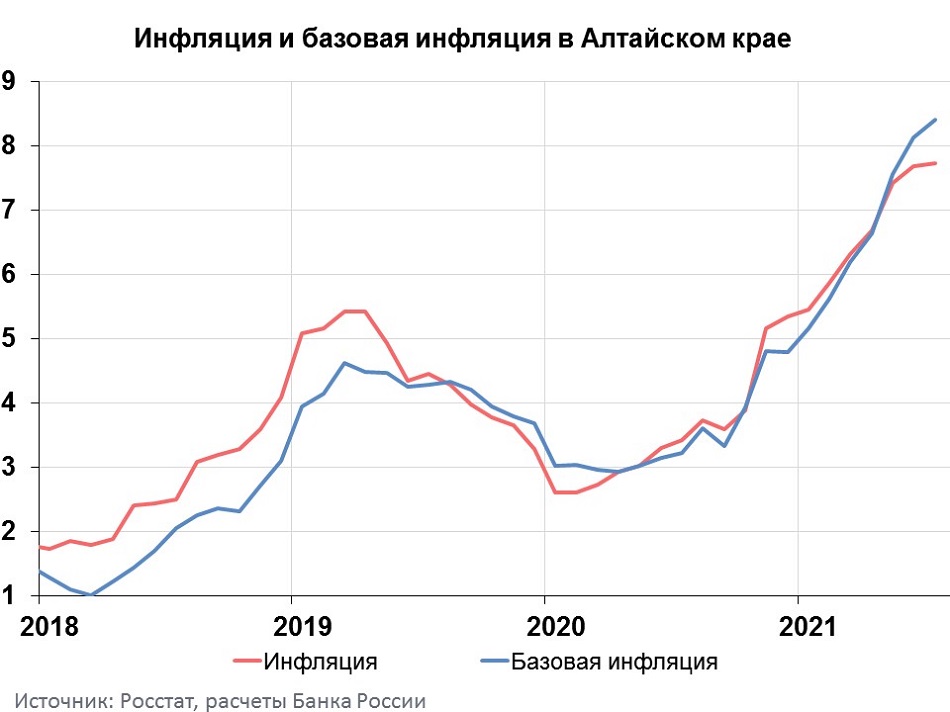 В июле годовая инфляция в Алтайском крае ускорилась по сравнению с июнем на 0,06 п.п., до 7,74%. Это выше, чем в целом по Сибирскому федеральному округу и по России (6,88% и 6,46% соответственно). Влияние на ускорение инфляции в крае оказало продолжающееся расширение потребительского спроса в условиях давления со стороны издержек производителей и поставщиков на непродовольственном рынке.