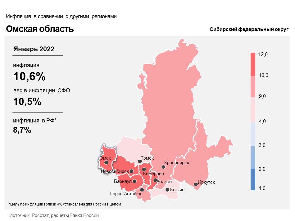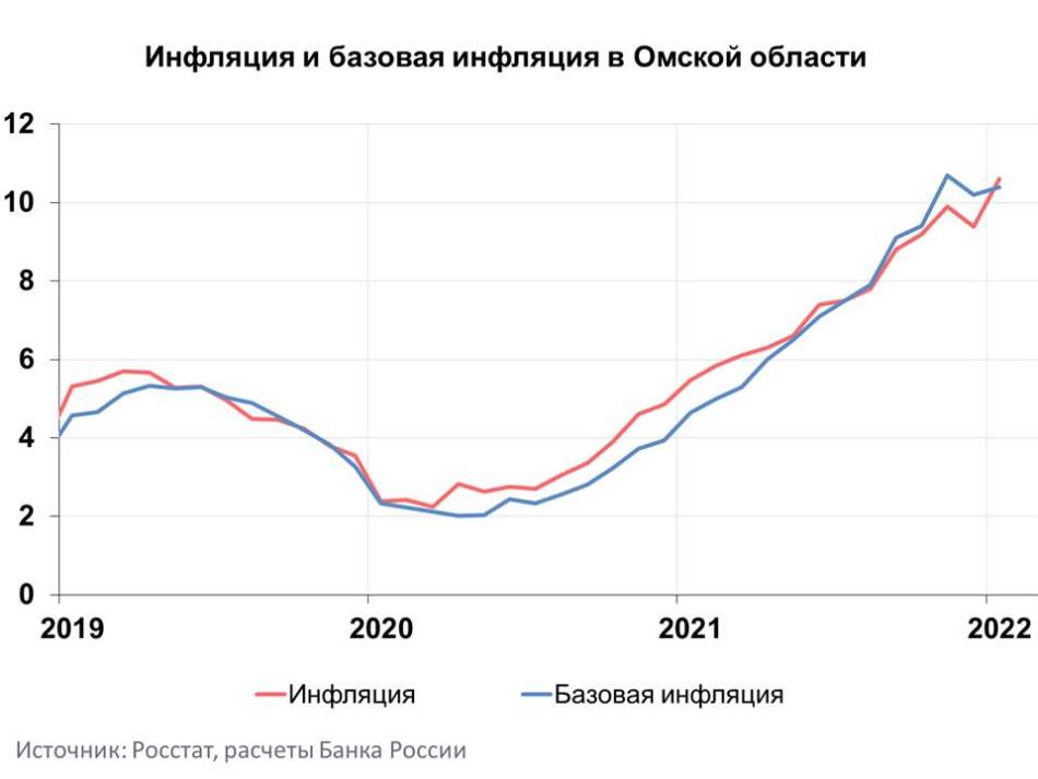 Годовая инфляция в Омской области в январе 2022 года ускорилась на 1,23 п.п., до 10,61%, оставаясь выше показателей по Сибирскому федеральному округу и по России в целом (9,92% и 8,73% соответственно). Динамику инфляции в регионе определили рост издержек производителей и поставщиков, сокращение предложения ряда продовольственных и непродовольственных товаров, а также индексация отдельных жилищно-коммунальных услуг.