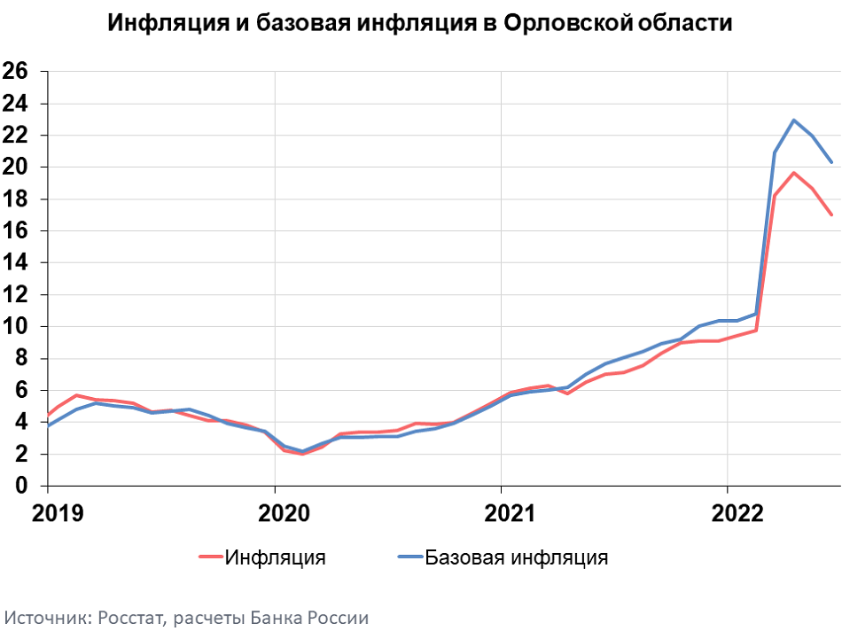 Годовая инфляция в Орловской области в июне замедлилась до 17,04% после 18,65% в мае, что соответствовало общероссийской динамике. При этом она по-прежнему оставалась выше, чем в Центральном федеральном округе и России (16,32% и 15,90% соответственно). Влияние на динамику инфляции в основном оказали такие факторы, как расширение предложения на отдельных товарных рынках, укрепление рубля, а также снижение спроса на некоторые непродовольственные товары после его всплеска весной.