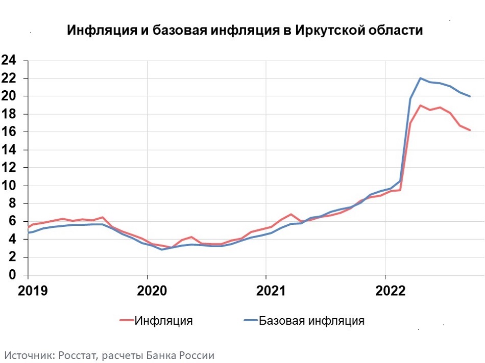 Годовая инфляция в Иркутской области в сентябре замедлилась по сравнению с августом на 0,52 п.п., до 16,23%. Годовой темп прироста цен в регионе остался выше, чем по Сибирскому федеральному округу (14,26%) и по России в целом (13,68%). Замедлению годовой инфляции способствовали расширение предложения на отдельных товарных рынках, сокращение затрат производителей и снижение потребительского спроса на ряд непродовольственных товаров.