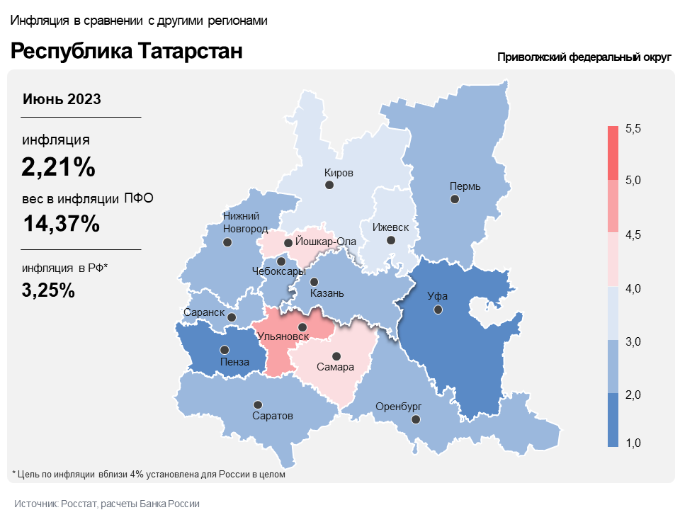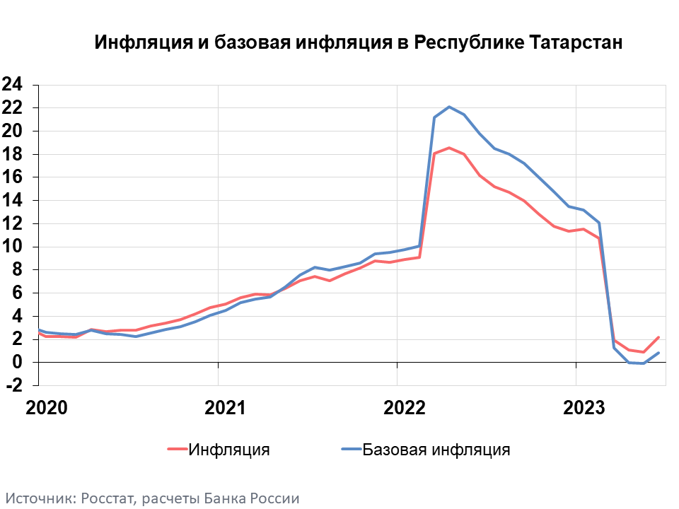 Годовая инфляция в Республике Татарстан в июне 2023 года ускорилась до 2,21% после 0,93% в мае. Она оставалась ниже значения по Приволжскому федеральному округу и России в целом, где годовая инфляция ускорилась до 2,70% и 3,25% соответственно. К ускорению годового роста цен в республике привели ослабление рубля, повышение спроса на ряд непродовольственных товаров и увеличение туристического потока в регион.