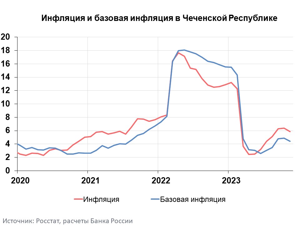 Годовая инфляция в Чеченской Республике в ноябре 2023 года замедлилась до 5,87% после 6,38% в октябре. Это ниже, чем в Северо-Кавказском федеральном округе (8,31%) и по стране в целом (7,48%). Основным фактором замедления инфляции в регионе стало увеличение предложения на рынке непродовольственных товаров и в сфере услуг.