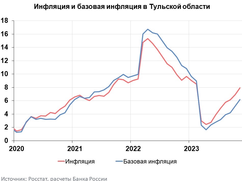 Годовая инфляция в Тульской области в ноябре 2023 года повысилась и составила 7,93% после 6,91% в октябре. Аналогичная динамика отмечалась в целом по России и по Центральному федеральному округу. При этом уровень региональной инфляции сложился выше общероссийского (7,48%) и в целом по округу (7,58%). Рост цен в Тульской области ускорился из-за произошедшего ранее ослабления рубля, увеличения затрат производителей, снижения предложения отдельных продовольственных товаров, сохранения высокого потребительского спроса на некоторые непродовольственные товары.