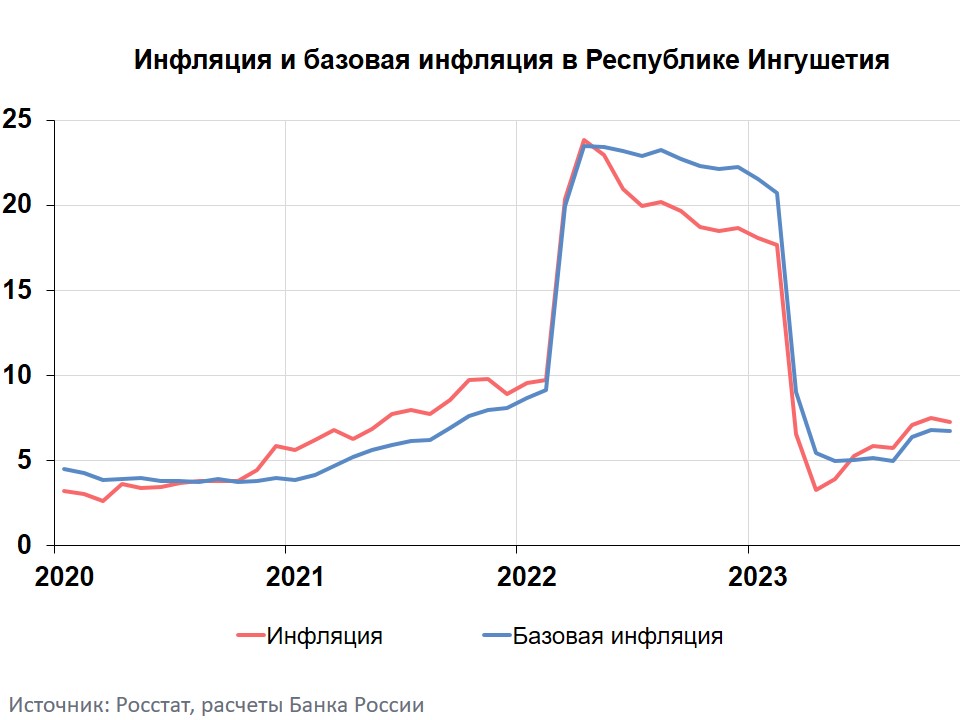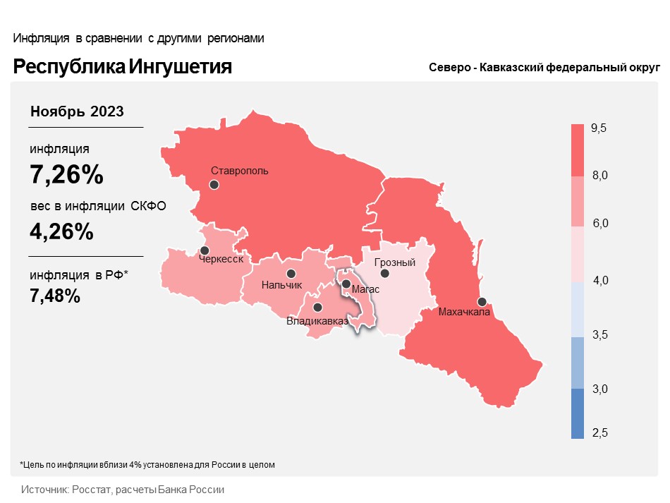 Годовая инфляция в Республике Ингушетия в ноябре замедлилась до 7,26% после 7,49% в октябре. Она сложилась ниже уровней по России в целом (7,48%) и Северо-Кавказскому федеральному округу (8,31%). В ноябре инфляция в регионе снизилась во многом благодаря увеличению предложения на рынке отдельных товаров и расширению полетных программ авиаперевозчиков.