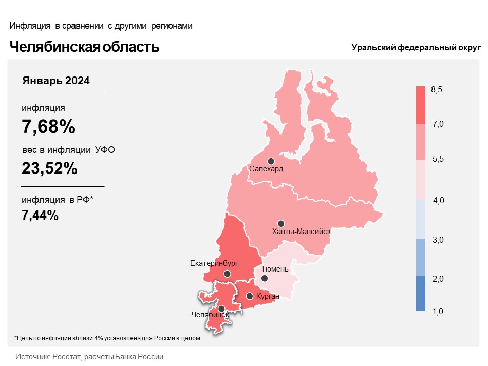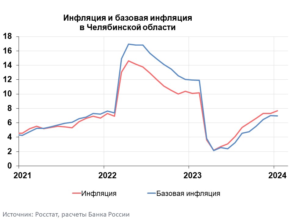 Годовая инфляция в Челябинской области ускорилась с 7,31% в декабре 2023 года до 7,68% в январе 2024 года. Это выше показателя по Уральскому федеральному округу (6,90%) и по стране в целом (7,44%). Ускорение инфляции преимущественно обусловлено ростом издержек производителей продовольственных товаров и поставщиков услуг, а также действием эффекта низкой базы января прошлого года в сфере авиаперевозок.