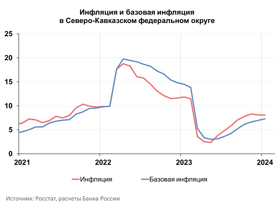 Годовая инфляция в Северо-Кавказском федеральном округе (СКФО) в январе 2024 года почти не изменилась и составила 8,07% после 8,11% в декабре 2023 года. Предложение непродовольственных товаров увеличилось, а потребительский спрос на них продолжил охлаждаться. В то же время возросли издержки производителей и поставщиков продовольствия, сократилось предложение отдельных продуктов питания. Кроме того, сохранялся повышенный спрос со стороны туристов. В результате ускорение роста цен на продовольствие нивелировало замедление роста цен на непродовольственные товары. В целом по России инфляция также почти не изменилась (7,44% в январе после 7,42% в декабре 2023 года).