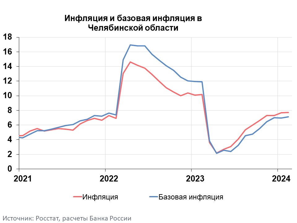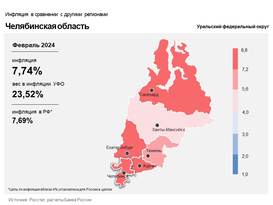 В феврале 2024 года годовая инфляция в Челябинской области ускорилась до 7,74% после 7,68% в январе. Это выше показателя по Уральскому федеральному округу (7,08%) и по стране в целом (7,69%). Годовой рост цен преимущественно ускорился из-за роста издержек производителей и поставщиков ряда непродовольственных товаров при сохранении высокого потребительского спроса, а также эффекта низкой базы февраля прошлого года в ценах на отдельные виды электроники и техники для дома.