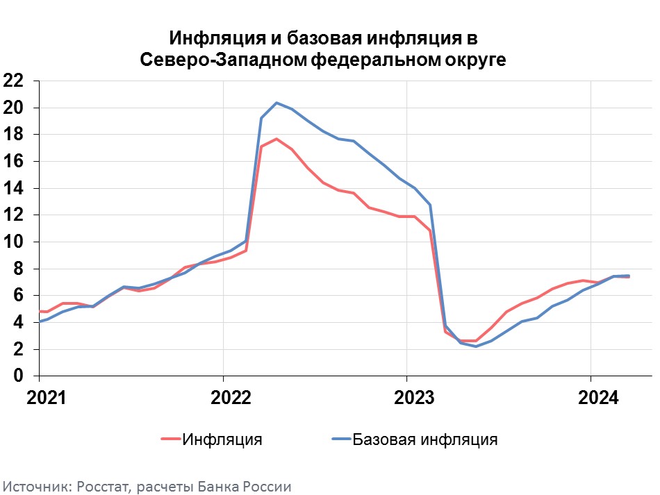Спрос на Северо-Западе оставался высоким, в том числе за счет роста зарплат, что подпитывало повышение цен на широкий круг товаров. Так, производители мебели, медицинских товаров продолжали перекладывать свои издержки в цены конечной продукции. Поэтому она ускоренно дорожала в годовом выражении.