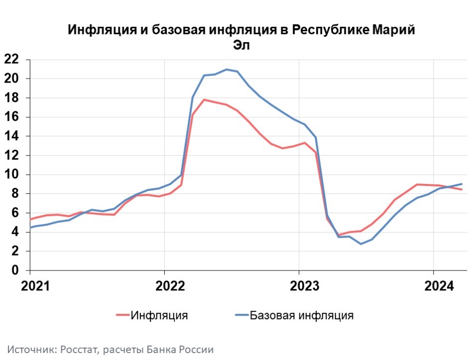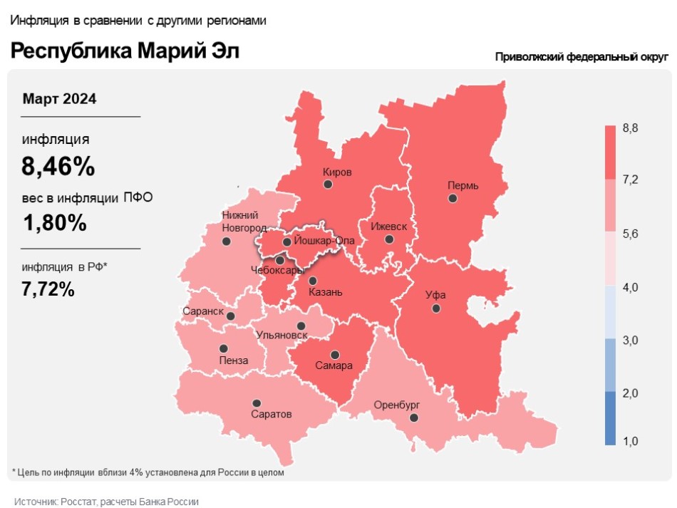 Годовая инфляция в Республике Марий Эл в марте 2024 года замедлилась до 8,46% после 8,66% в феврале. Основная причина – расширение предложения ряда продуктов питания. При этом такая динамика также объясняется влиянием эффекта высокой базы прошлого года. Однако уровень инфляции в регионе остался выше, чем в Приволжском федеральном округе (7,41%) и в целом в России (7,72%).