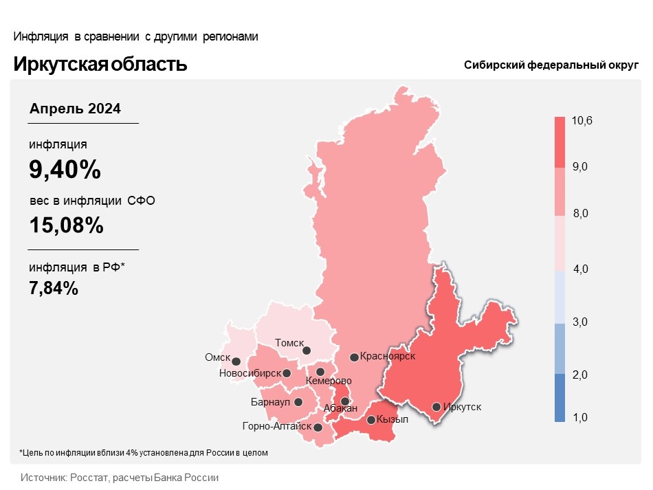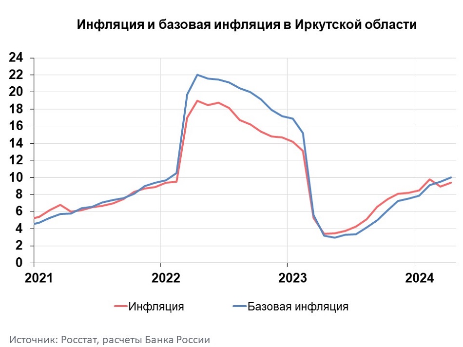 Годовая инфляция в Иркутской области в апреле ускорилась до 9,40% после 8,95% в марте. При этом темп прироста цен в регионе был выше, чем по Сибирскому федеральному округу (8,76%) и по России в целом (7,84%). Годовой рост цен в регионе ускорился в основном из-за переноса в цены увеличившихся издержек производителей и поставщиков товаров и услуг, снижения предложения на некоторых товарных рынках. Кроме того, в услугах проявился эффект низкой сравнительной базы прошлого года в сфере авиаперевозок.
