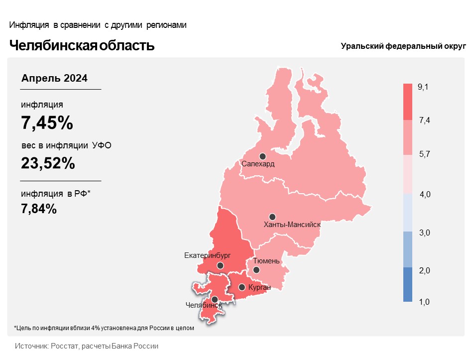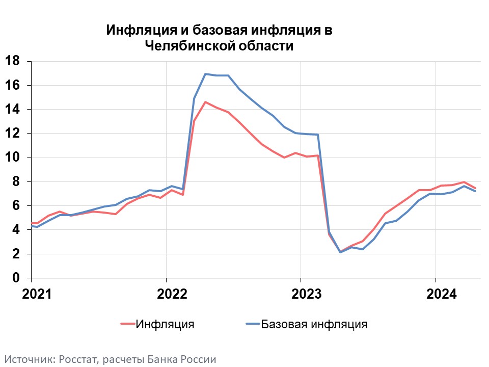 В апреле 2024 года годовая инфляция в Челябинской области снизилась до 7,45% после 7,99% в марте. Это несколько выше показателя по Уральскому федеральному округу (7,42%), но ниже, чем по стране в целом (7,84%). Замедление годового роста цен в регионе преимущественно обусловлено расширением предложения отдельных видов продовольствия и услуг пассажирского транспорта.