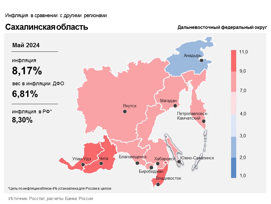 Годовая инфляция в Дальневосточном федеральном округе в мае 2024 года ускорилась и составила 9,15% после 8,75% в апреле. Это выше, чем в целом по стране (8,30%). Цены в округе росли быстрее из-за высокого потребительского спроса, опережающего возможности предложения, сжатия предложения отдельных товаров и услуг, а также повышения издержек производителей и поставщиков.