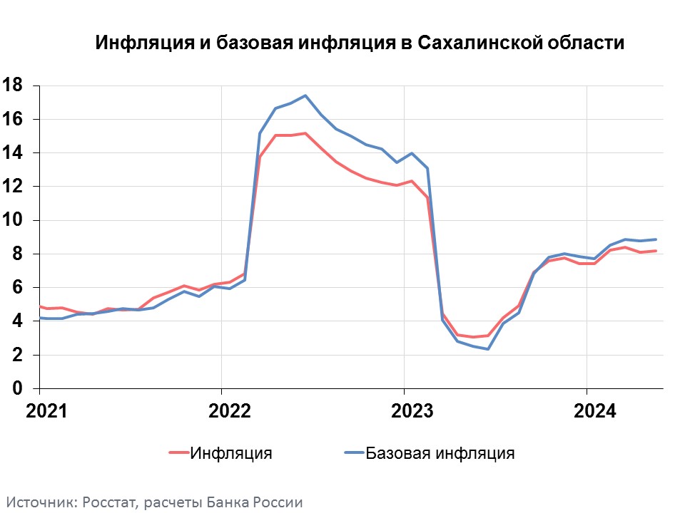 Годовая инфляция в Сахалинской области в мае 2024 года почти не изменилась по сравнению с апрелем и составила 8,17%. Это ниже значений по России в целом (8,30%) и по Дальневосточному федеральному округу (9,15%). Рост издержек производителей и сокращение предложения отдельных товаров ускоряли инфляцию. В то же время годовой рост цен в регионе замедлило снижение цен на некоторые непродовольственные товары. Кроме того, в динамике цен на некоторые услуги наблюдался эффект высокой базы.