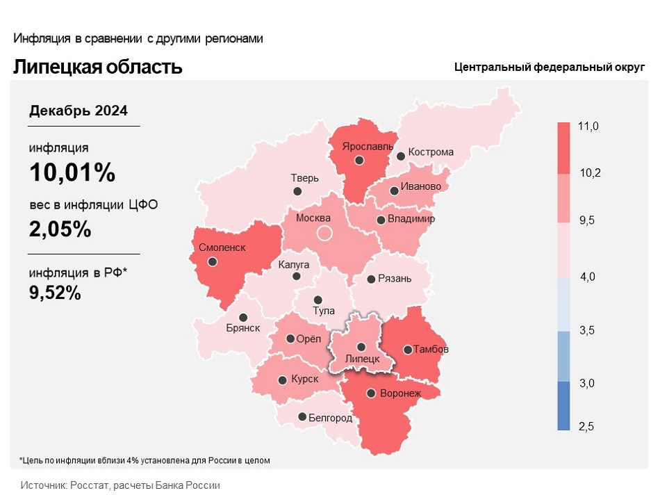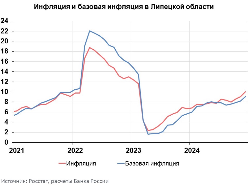 Годовая инфляция в Липецкой области увеличилась с 9,05% в ноябре до 10,01% в декабре 2024 года. При этом она сложилась выше, чем в Центральном федеральном округе (9,92%) и по России в целом (9,52%), где годовая инфляция также повысилась. Инфляция в регионе ускорилась из-за роста издержек производителей товаров и поставщиков услуг, ослабления рубля и высокого спроса на отдельные непродовольственные товары. Также сократилось предложение на некоторых товарных рынках.