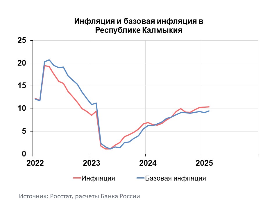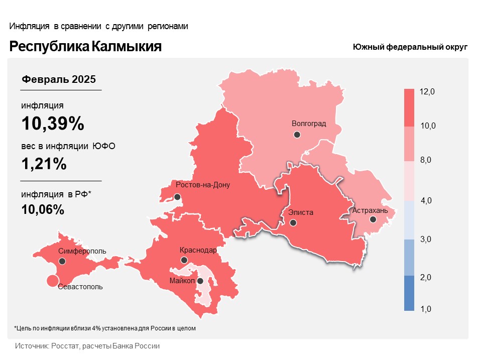 Годовая инфляция в Республике Калмыкия в феврале 2025 года выросла до 10,39% после 10,30% в январе. Она по-прежнему была выше значений по России (10,06%) и Южному федеральному округу (10,08%). Основными причинами ускорения инфляции в регионе стали увеличение тарифов на некоторые услуги, высокий спрос на жилье со стороны туристов, а также рост издержек производителей и поставщиков непродовольственных товаров.