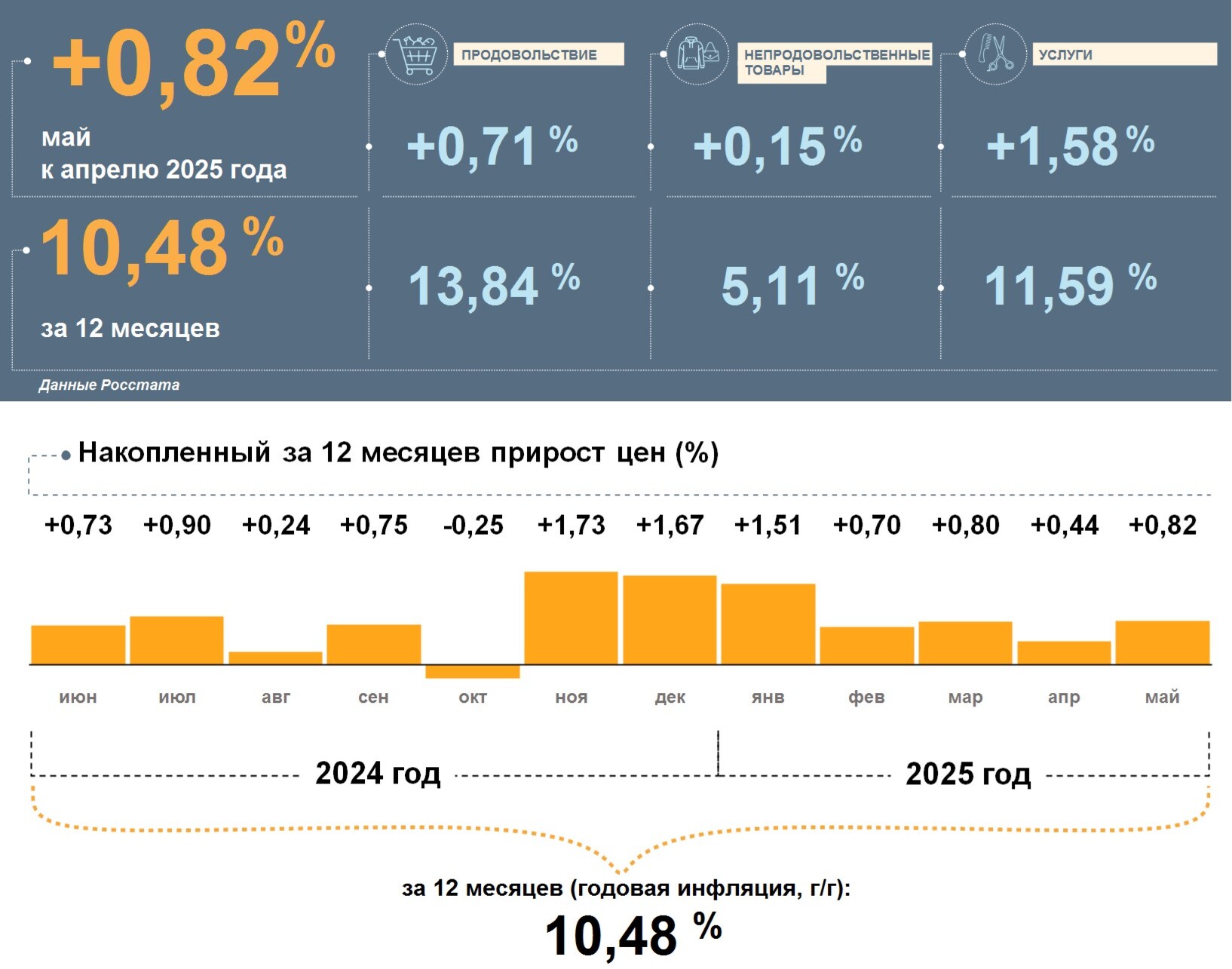 Цены в Ярославской области в мае 2025 года, по данным Росстата, выросли на 0,82% к апрелю. Годовая инфляция снизилась и составила 10,48%. Это выше, чем в целом по стране (9,88%).