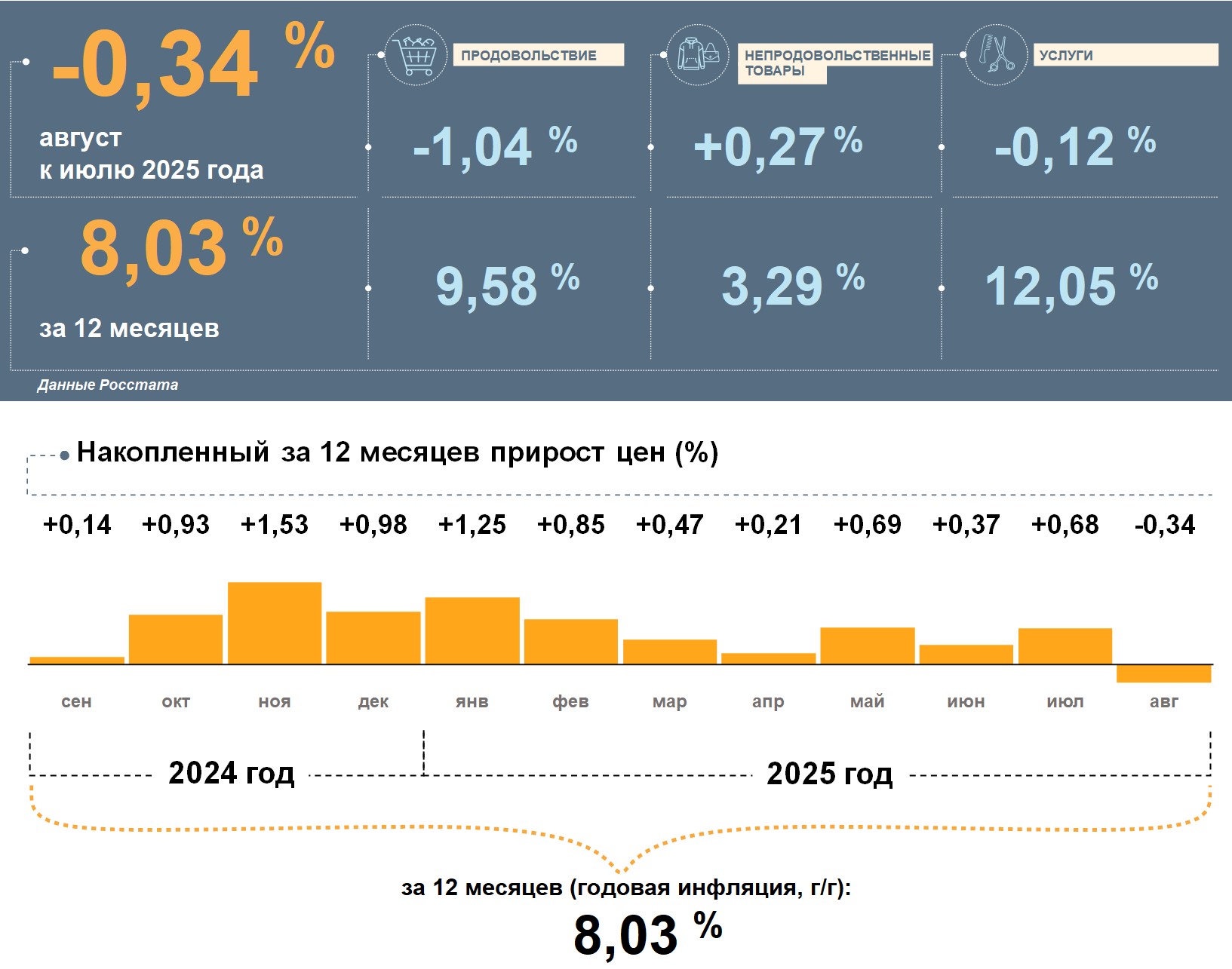Цены в Республике Башкортостан в августе 2025 года, согласно данным Росстата, снизились на 0,34% к июлю. Годовая инфляция снижалась три месяца подряд и в августе составила 8,03%, что немного ниже, чем в целом по России (8,14%).