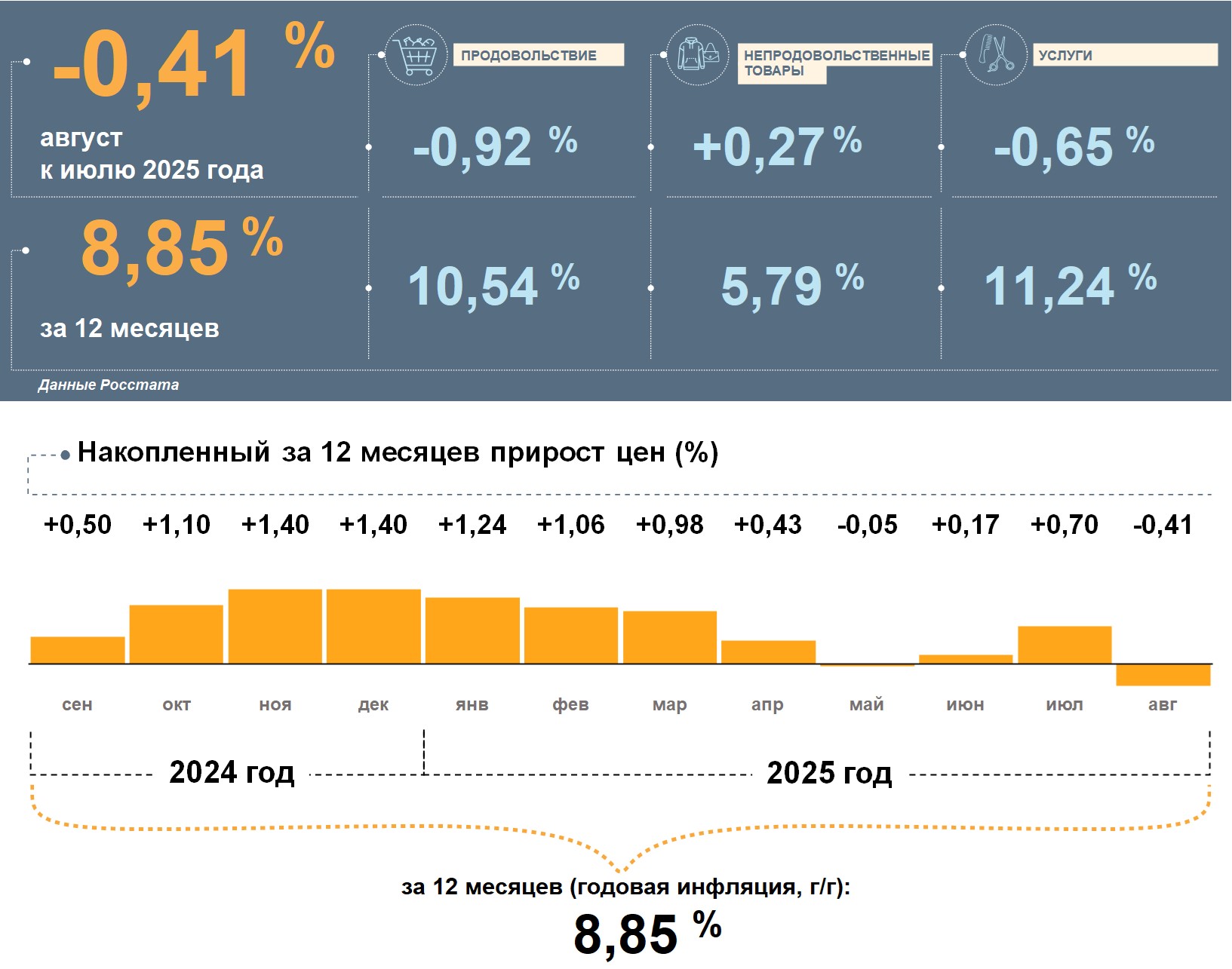 Цены в Алтайском крае в августе 2025 года, по данным Росстата, снизились на 0,41% к июлю этого года. Годовая инфляция снижалась четвертый месяц подряд и составила в августе 8,85%. Это выше, чем в целом по стране (8,14%).