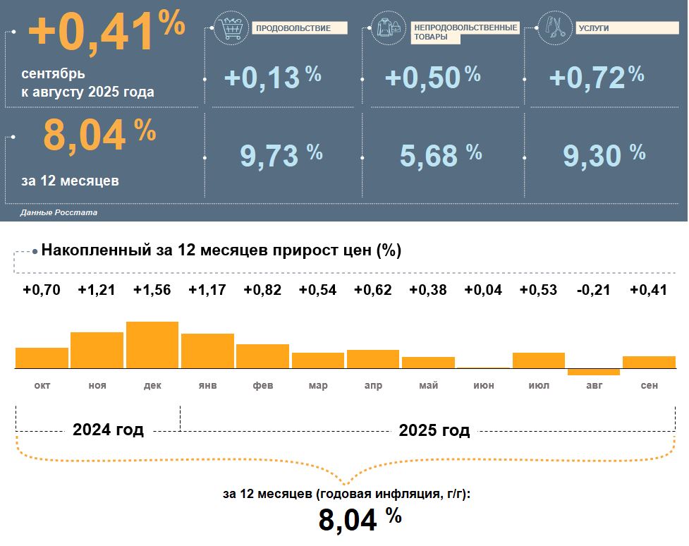Цены в Белгородской области в сентябре 2025 года, по данным Росстата, выросли на 0,41% к августу. Годовая инфляция немного уменьшилась и составила 8,04%. Это выше, чем в целом по стране (7,98%).