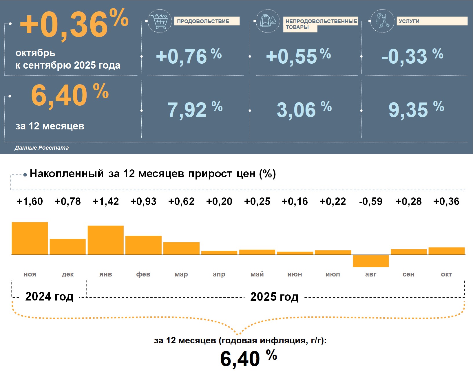 Цены в Архангельской области (без учета НАО) в октябре 2025 года, по данным Росстата, выросли на 0,36% к сентябрю. Годовая инфляция снижается седьмой месяц подряд – в октябре она составила 6,40%. Это по-прежнему ниже, чем в целом по стране (7,71%).