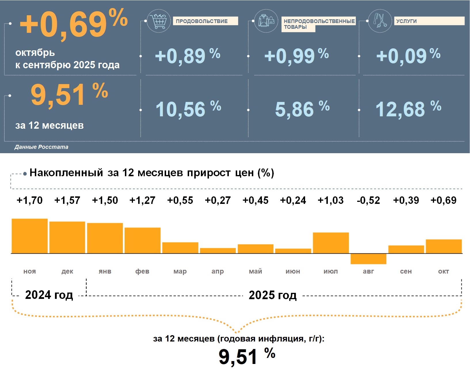 Цены в Свердловской области в октябре 2025 года, по данным Росстата, выросли на 0,69% к сентябрю. Годовая инфляция замедлилась и составила 9,51%, но осталась выше, чем по стране (7,71%).