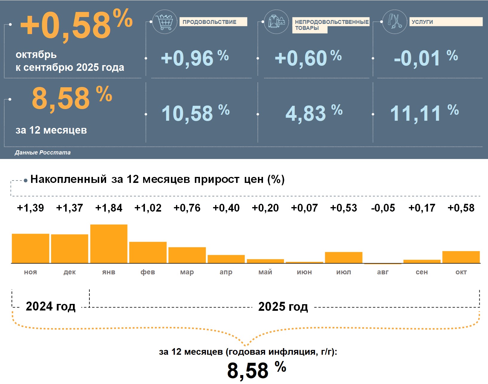 Цены в Ивановской области в октябре 2025 года по данным Росстата выросли на 0,58%. Годовая инфляция снизилась и составила 8,58%. Это выше, чем в целом по стране (7,71%).