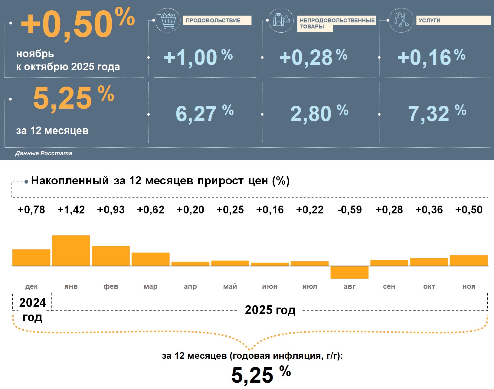 В ноябре сильнее всего подорожали продукты, при этом непродовольственные товары и услуги выросли в цене умеренно. За 12 месяцев цены на продукты и услуги выросли больше, чем на потребительскую корзину в целом, а на непродовольственные товары – меньше.