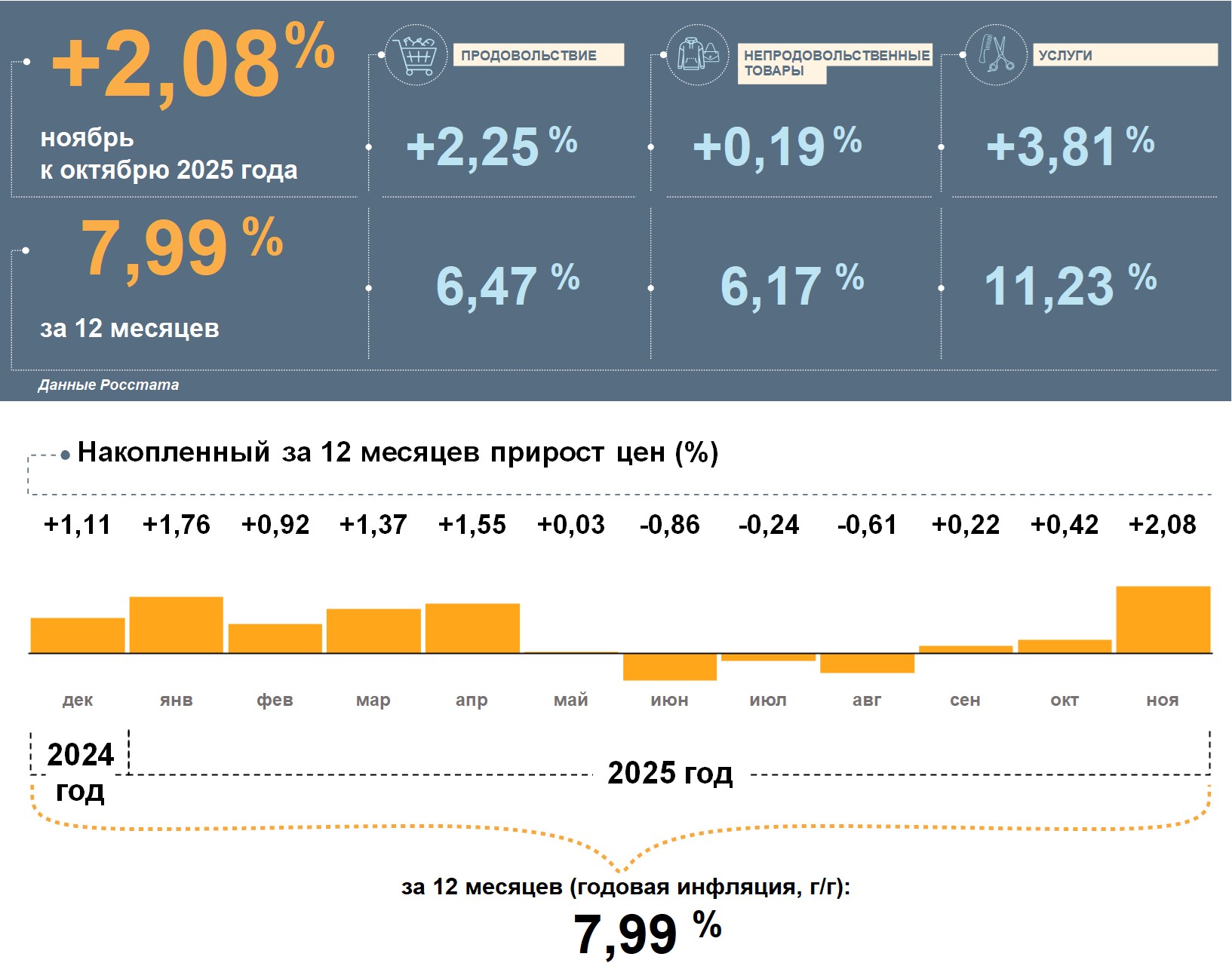Цены в Ненецком автономном округе в ноябре 2025 года, по данным Росстата, выросли на 2,08% к октябрю. Годовая инфляция повысилась и составила 7,99%. Это выше, чем в целом по стране (6,64%).