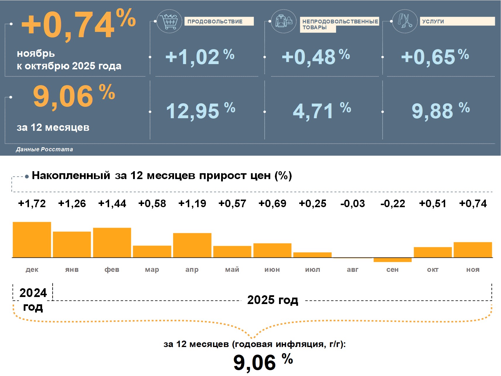 Цены в Калининградской области в ноябре 2025 года, по данным Росстата, выросли на 0,74% к октябрю. Годовая инфляция замедлилась и в ноябре составила 9,06%. Это выше, чем в целом по стране (6,64%).