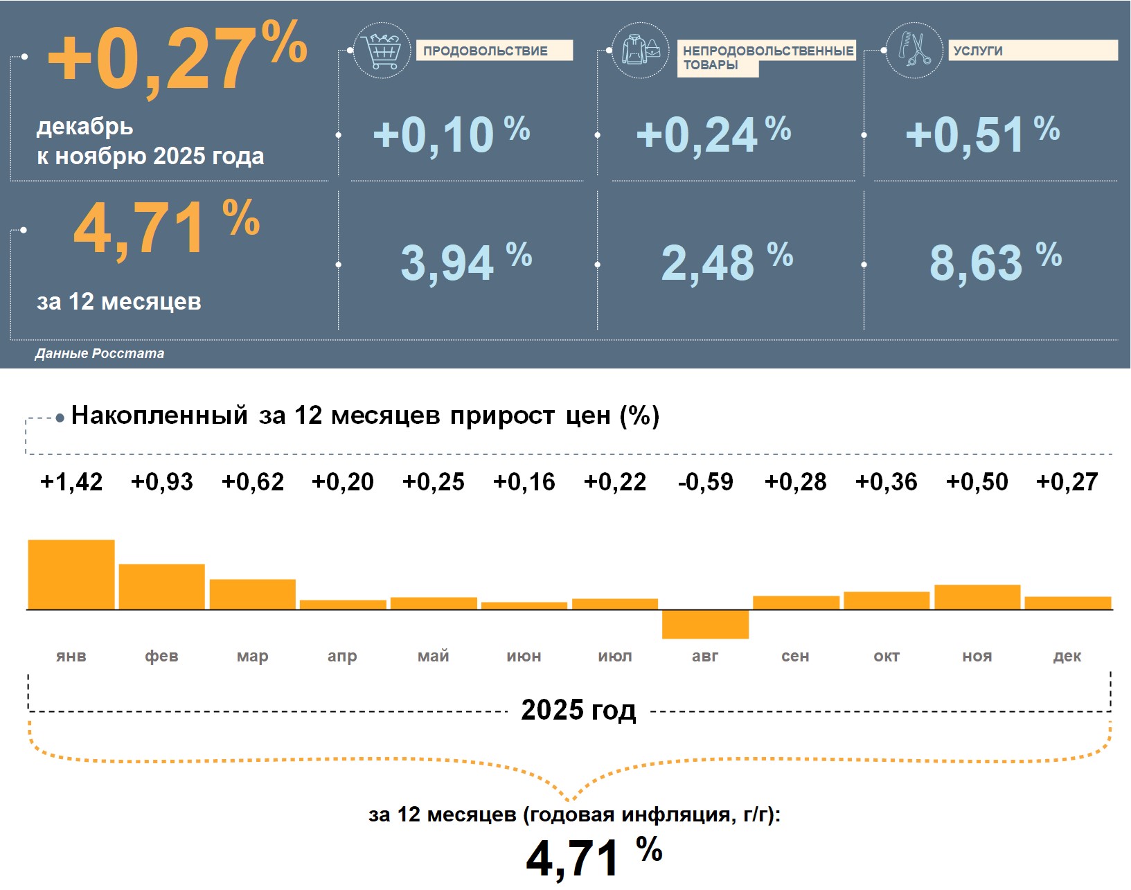 Цены в Архангельской области (без учета НАО) в декабре 2025 года, по данным Росстата, выросли на 0,27% к ноябрю. Годовая инфляция снижается девятый месяц подряд – в декабре она составила 4,71%. Это по-прежнему ниже, чем в целом по стране (5,59%).