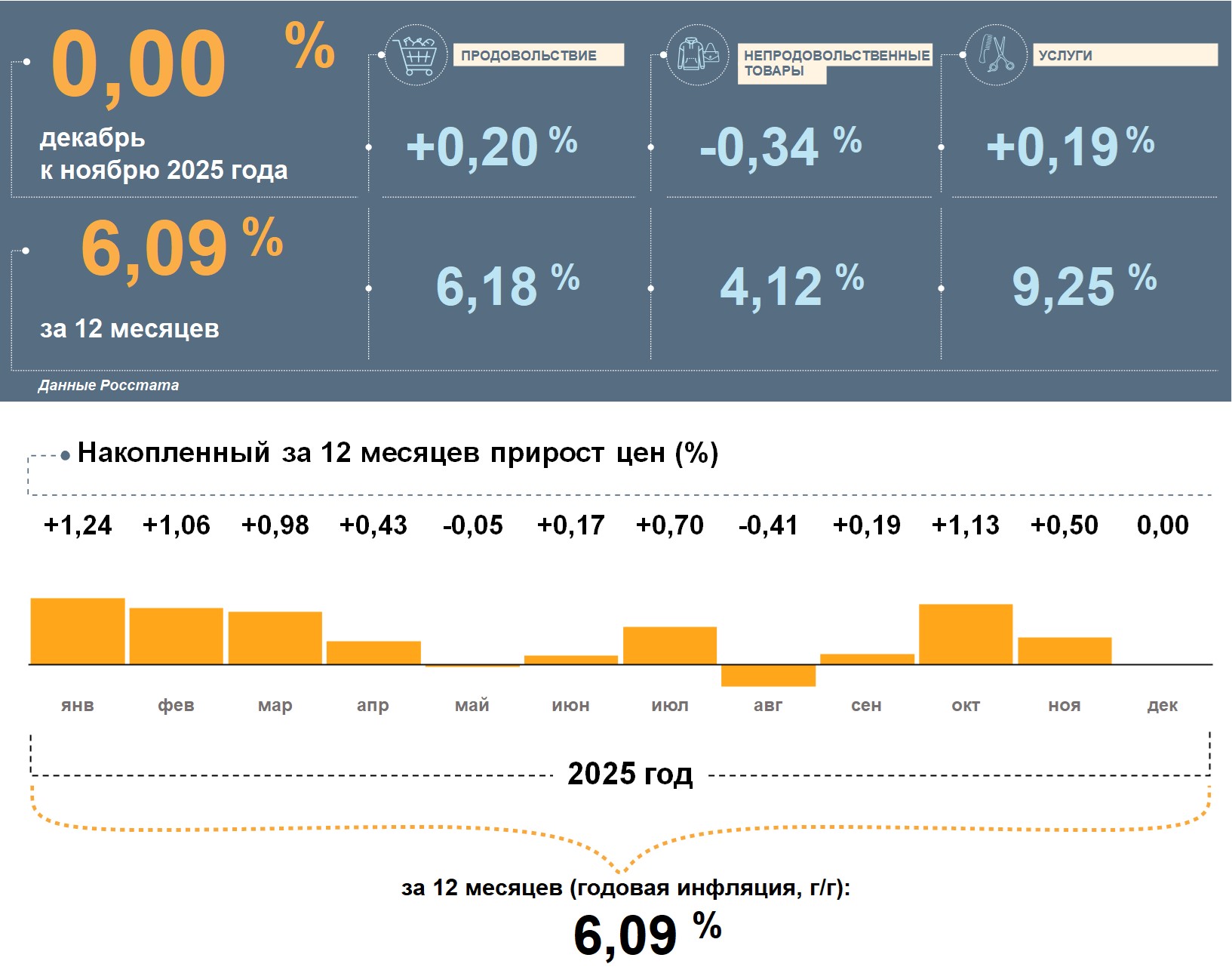 В декабре подешевели непродовольственные товары. Продукты питания и услуги за месяц умеренно выросли в цене. Накопленным итогом за 12 месяцев сильнее всего повысились цены на услуги. Продовольствие за год прибавило в цене несколько больше, чем потребительская корзина в целом, а непродовольственные товары — заметно меньше.