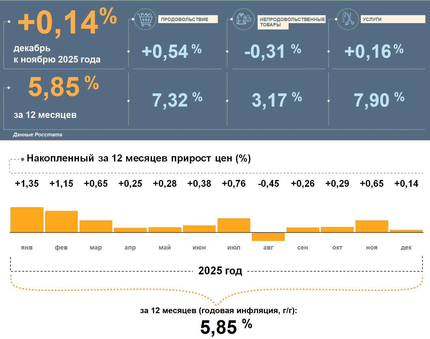 Значительнее всего в декабре подорожали продовольственные товары, а за год цены на них выросли больше, чем на потребительскую корзину в целом. Услуги в декабре дорожали умеренно, но годовой рост цен на них наиболее заметный. Непродовольственные товары в декабре подешевели, а за 12 месяцев цены на них показали сдержанный рост.