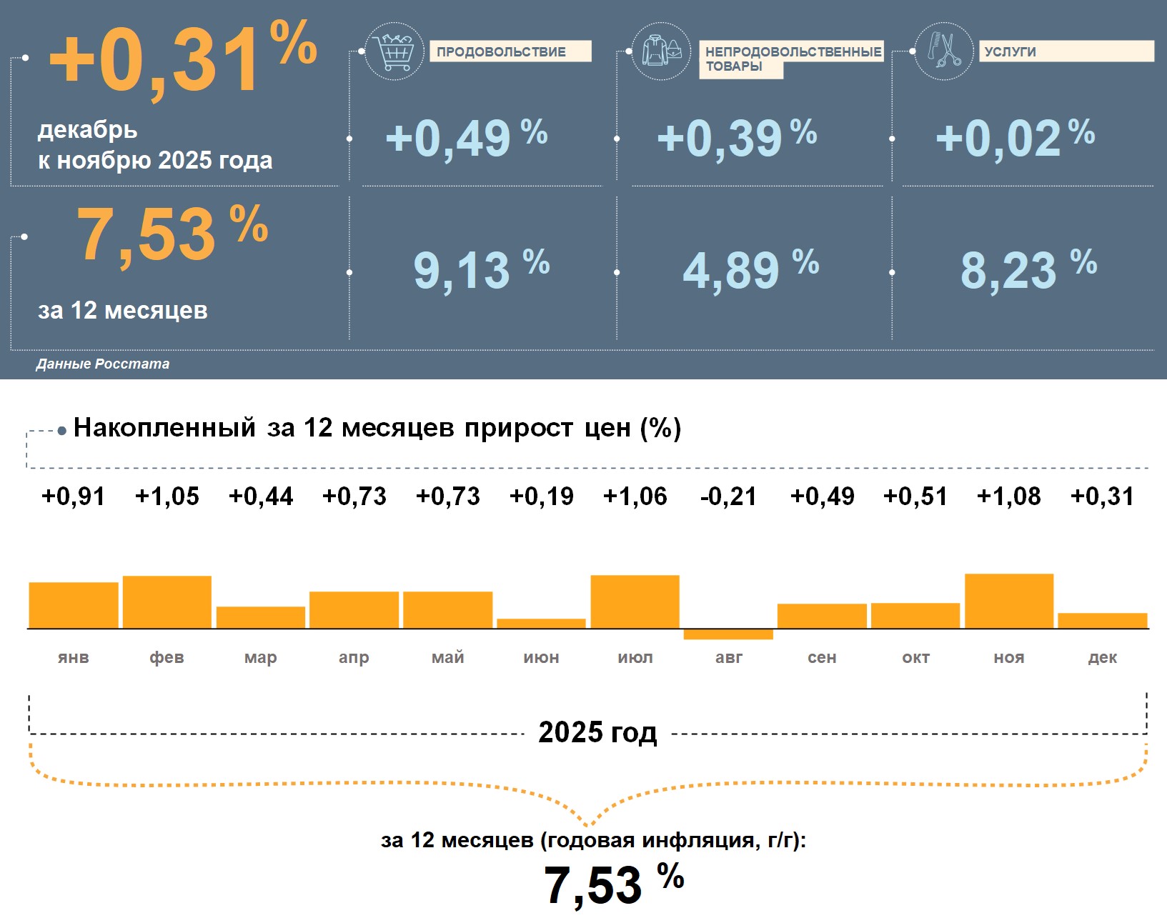 Цены в Республике Саха (Якутия) в декабре 2025 года, по данным Росстата, увеличились на 0,31% по отношению к ноябрю. Годовая инфляция замедлялась третий месяц подряд и составила 7,53%. Это выше, чем в целом по стране (5,59%).