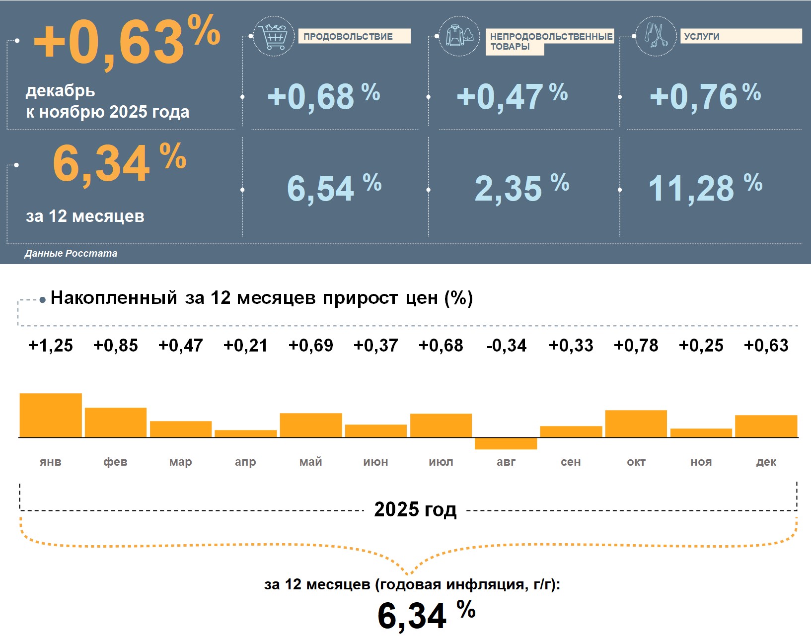 Цены в Республике Башкортостан в декабре 2025 года, согласно данным Росстата, выросли на 0,63% к ноябрю. Годовая инфляция снизилась и составила 6,34%. Это выше, чем в целом по стране (5,59%).