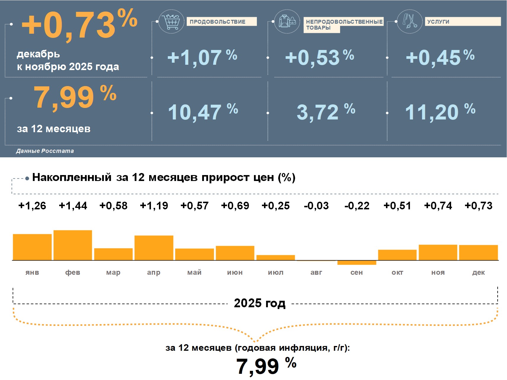 Цены в Калининградской области в декабре 2025 года, по данным Росстата, выросли на 0,73% к ноябрю. Годовая инфляция замедляется четвертый месяц подряд и в декабре составила 7,99%. Это выше, чем в целом по стране (5,59%).