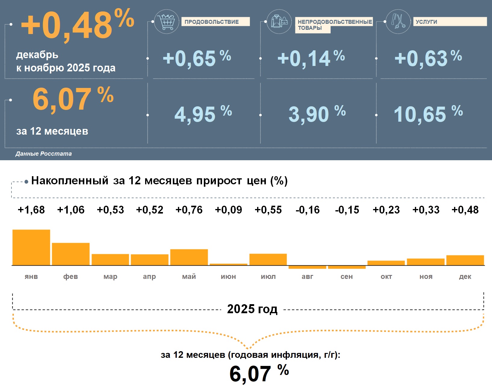 Цены в Брянской области в декабре 2025 года, по данным Росстата, увеличились на 0,48% к ноябрю. Годовая инфляция замедлилась и составила 6,07%. Это выше, чем в целом по стране (5,59%).