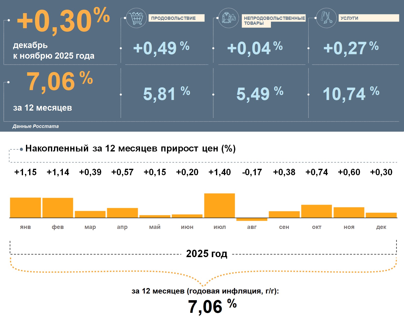 Заметнее всего в декабре выросла стоимость продуктов питания, но в целом за 2025 год продовольствие подорожало меньше, чем вся потребительская корзина. Цены на услуги за месяц выросли умеренно, хотя накопленным итогом за 12 месяцев они подорожали наиболее заметно. Менее всего в декабре, а также в годовом выражении дорожали непродовольственные товары.