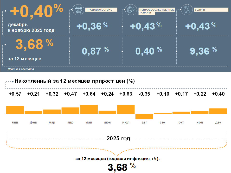 Цены в Москве в декабре 2025 года, по данным Росстата, выросли на 0,40% к ноябрю. Годовая инфляция постепенно замедлялась с начала 2025 года – в декабре она составила 3,68%. Это ниже, чем в целом по стране (5,59%).