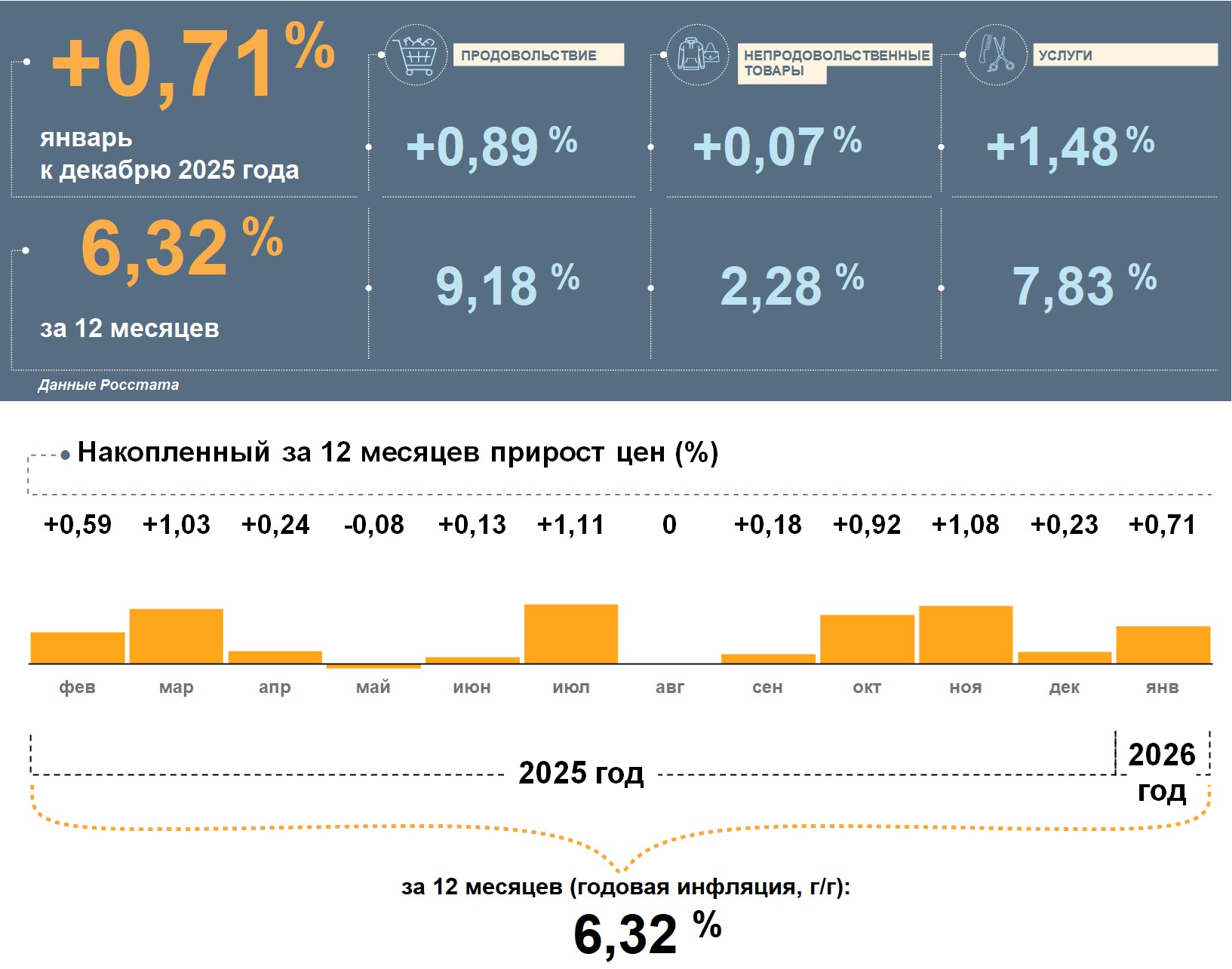 По данным Росстата, после длительного снижения годовая инфляция в России в январе 2026 года ожидаемо повысилась. Однако это не разворот тренда, а результат влияния разовых факторов. После их исчерпания инфляция вновь замедлится. По прогнозу Банка России, в 2026 году она снизится до 4,5–5,5%, а в 2027 году и в дальнейшем будет находиться на цели вблизи 4%.