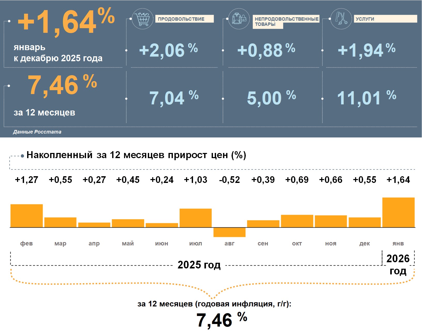 По данным Росстата, после длительного снижения годовая инфляция в России в январе 2026 года ожидаемо повысилась. Однако это не разворот тренда, а результат влияния разовых факторов. После их исчерпания инфляция вновь замедлится. По прогнозу Банка России, в 2026 году она снизится до 4,5–5,5%, а в 2027 году и в дальнейшем будет находиться на цели вблизи 4%.