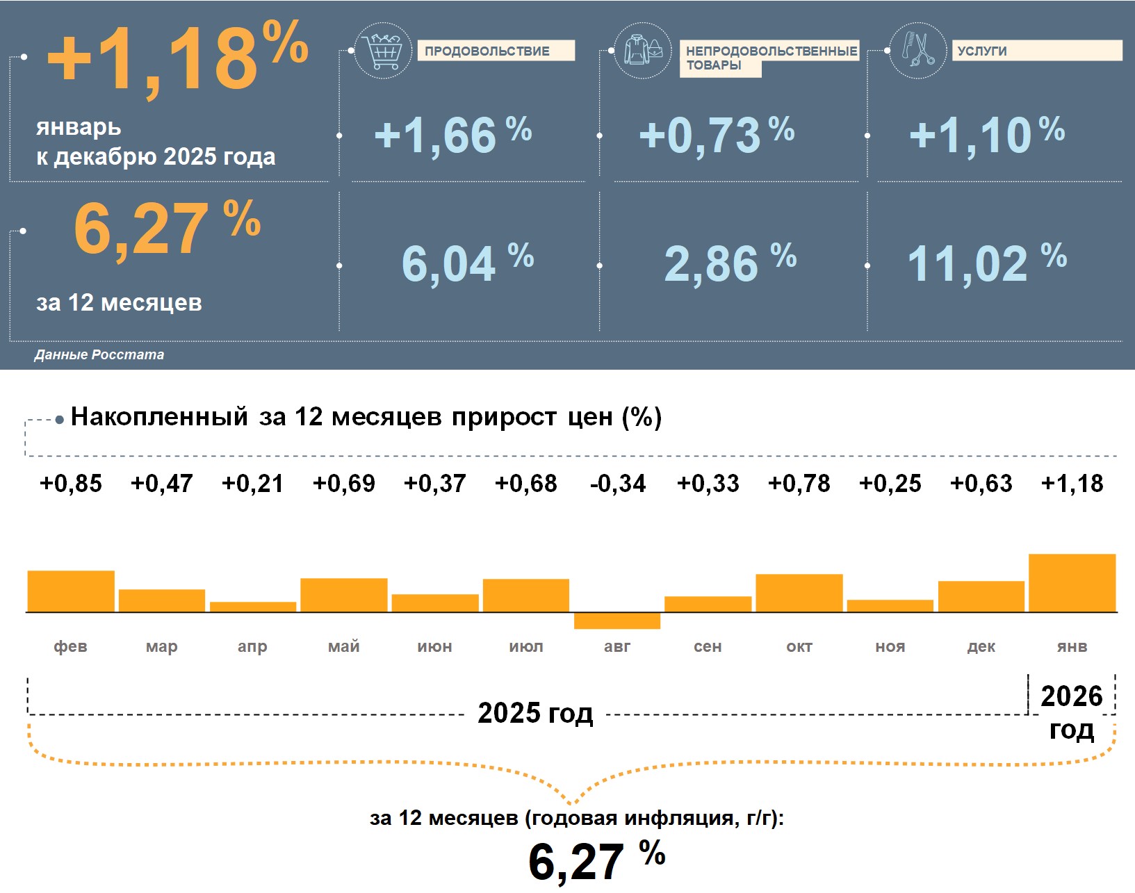 Цены в Республике Башкортостан в январе 2026 года, согласно данным Росстата, выросли на 1,18% к декабрю 2025 года. Годовая инфляция снизилась и составила 6,27%. Это выше, чем в целом по стране (6,00%).