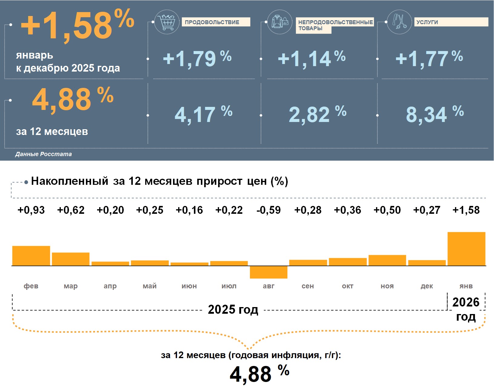 По данным Росстата, после длительного снижения годовая инфляция в России в январе 2026 года ожидаемо повысилась. Однако это не разворот тренда, а результат влияния разовых факторов. После их исчерпания инфляция вновь замедлится. По прогнозу Банка России, в 2026 году она снизится до 4,5–5,5%, а в 2027 году и в дальнейшем будет находиться на цели вблизи 4%.